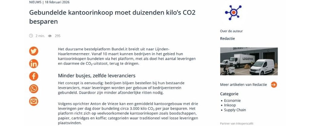 Het duurzame bestelplatform Bundel.it breidt uit naar Lijnden-Haarlemmermeer. Vanaf 10 maart kunnen bedrijven in het gebied hun kantoorinkopen bundelen via het platform, met als doel het aantal leveringen en daarmee de CO₂-uitstoot, terug te dringen.