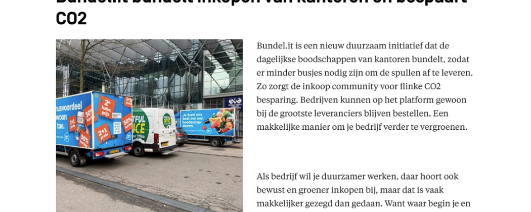 Bundel.it is een nieuw duurzaam initiatief dat de dagelijkse boodschappen van kantoren bundelt, zodat er minder busjes nodig zijn om de spullen af te leveren. Zo zorgt de inkoop community voor flinke CO2 besparing. Bedrijven kunnen op het platform gewoon bij de grootste leveranciers blijven bestellen. Een makkelijke manier om je bedrijf verder te vergroenen.