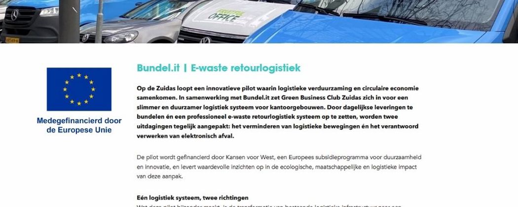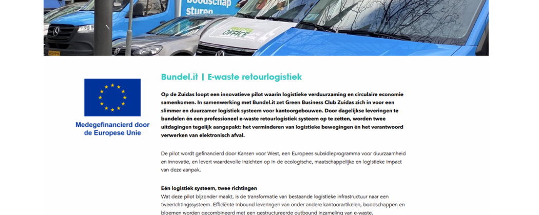 Op de Zuidas loopt een innovatieve pilot waarin logistieke verduurzaming en circulaire economie samenkomen. In samenwerking met Bundel.it zet Green Business Club Zuidas zich in voor een slimmer en duurzamer logistiek systeem voor kantoorgebouwen.